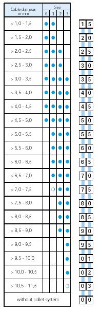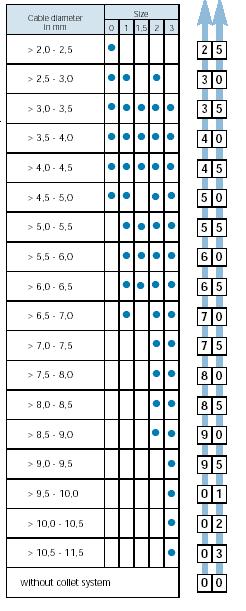 - возможно использование кабеля диаметром от 1,0 до 11,5 мм в зависимости от типоразмера