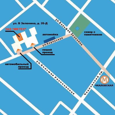 Схема проезда Схема прохода от метро "Чкаловская" - синим цветом, въезд на машине с улицы Корпусная - красным цветом |